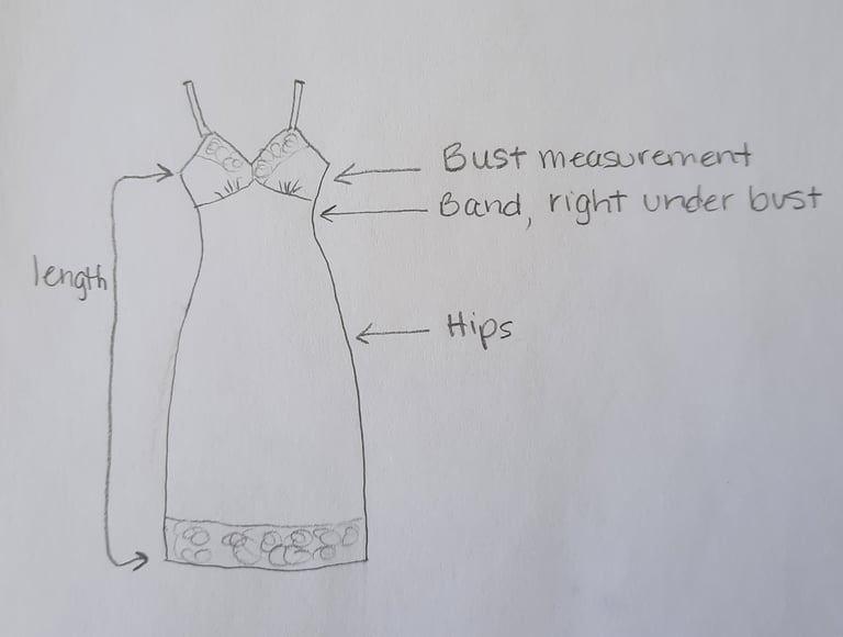 (It will not cost you a penny to measure, it just wouldn't let me post this without a number in that field😉)Styles #1-#14 are custom order styles. That means I make the slip after you order it and I use the measurements you provide to me for a good fit. Please include, Bust, band, hip and side length measurements when you order! Also, please order the corresponding bust size when you order. Sorry girls, the larger sizes cost a bit more.